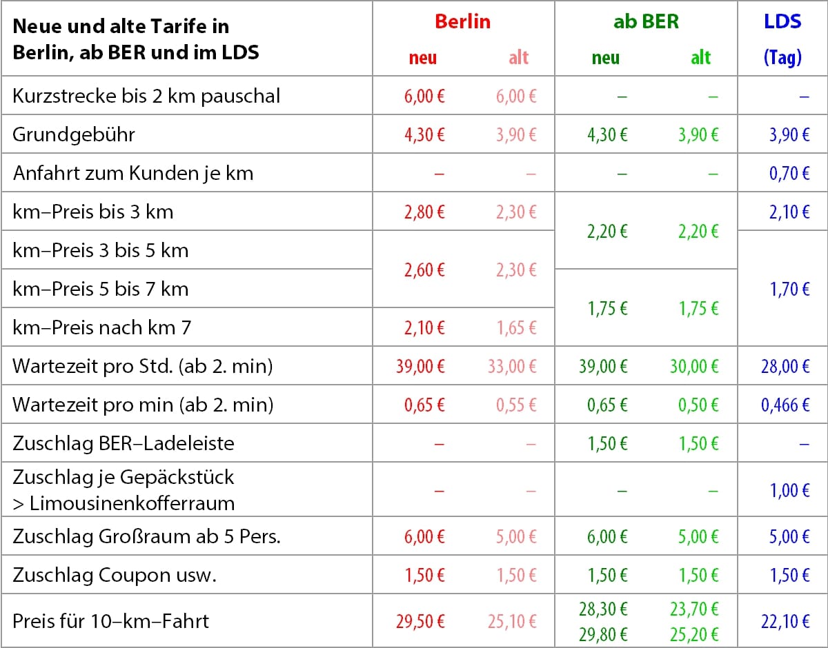 Beim BER-Tarif bleibt die eine Degressionsstufe bestehen, wobei der Kilometerpreis für die ersten fünf Kilometer von 2,20 auf 2,70 Euro und der für jeden weiteren Kilometer von 1,75 auf 2,10 Euro steigt.