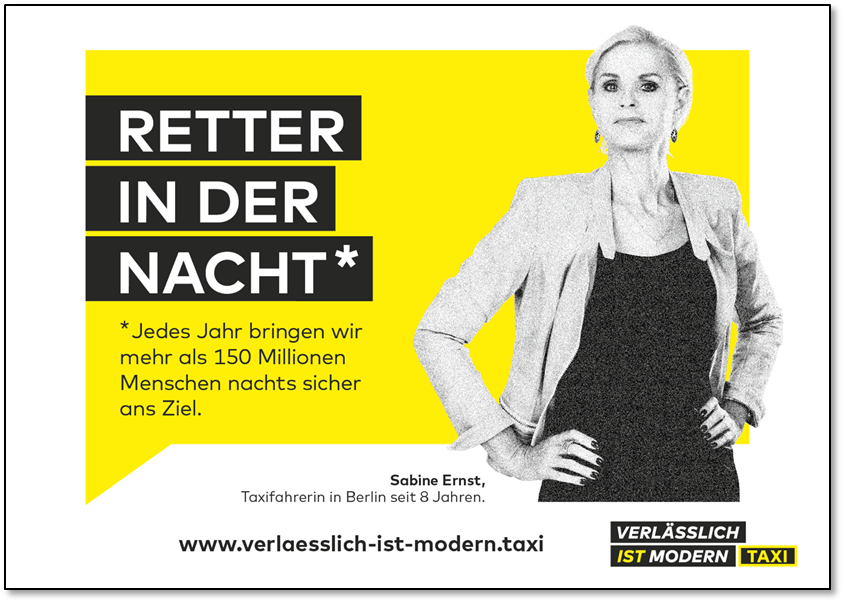 Die Taxifahrerin Sabine Ernst fungiert stellvertretend für die zahlreichen Kolleginnen und Kollegen als „Retter in der Nacht“. Auch dazu gibt es wieder eine klare Botschaft: „Jedes Jahr bringen wir mehr als 150 Millionen Menschen nachts sicher ans Ziel“. Oder auch tagsüber mehr als 72 Millionen Fahrgäste pro Jahr sicher zum Geschäftstermin, in Taxis, die „ein Büro auf Rädern sind“, wie es ein drittes Motiv suggeriert.