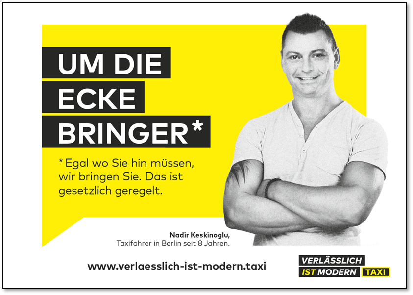 Die ersten Kampagnen-Motive zeigen denn auch erfahrene Taxifahrerinnen und Taxifahrer. Einer wie Nadir Keskinoglu. Er arbeitet seit acht Jahren als Berliner Taxifahrer und fungiert mit seinem muskulösen, hemdsärmeligen Erscheinungsbild als typischer „Um die Ecke bringer“. „Egal, wo Sie hinmüssen“, lautet anschließend die direkte Botschaft an den Fahrgast, „wir bringen Sie hin. Das ist gesetzlich geregelt.“