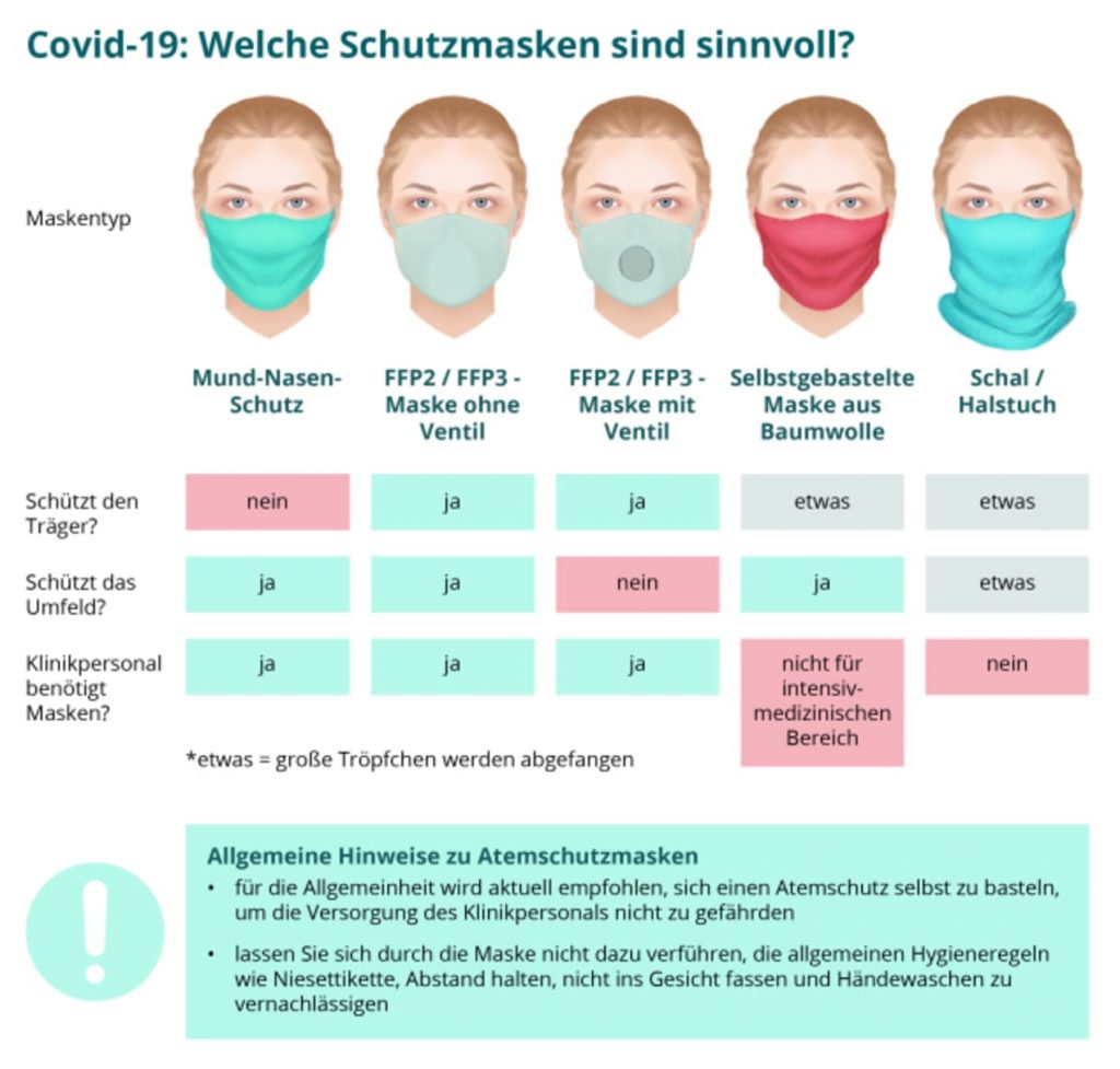 - Schal / Halstuch: mäßiger Schutz für Träger und Umfeld, größere Tröpfchen werden aufgehalten.