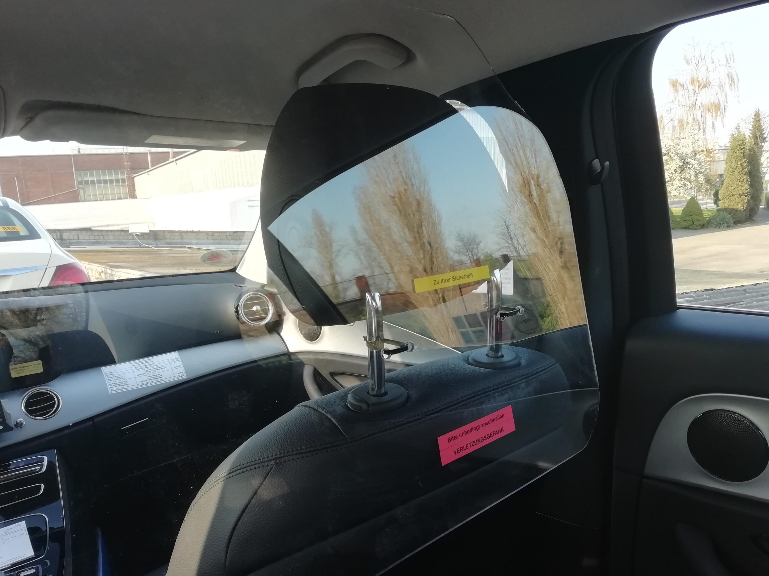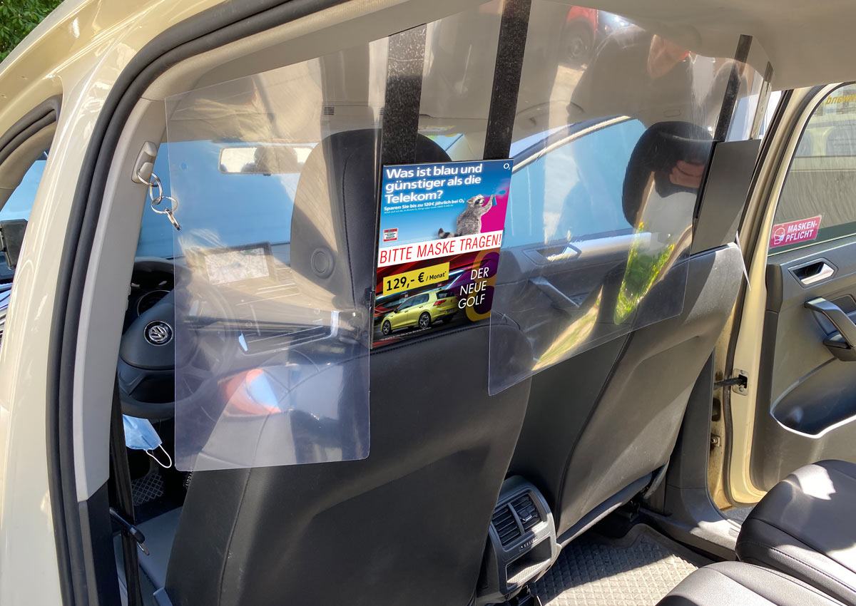 30.03.2020: Die Firma Profi Werbetechnik GmbH bietet einen Trennschutz aus bruch- und schlagfestem Polycarbonat an. Die transparente Scheibe wird dem jeweiligen Fahrzeug angepasst, ist abwischbar und kann desinfiziert werden. Der Trennschutz wird mit Kabelbindern an den Kopfstützen befestigt und ist für 80 Euro zuzüglich 9,90 Versand bestellbar. Kontakt: [email protected]