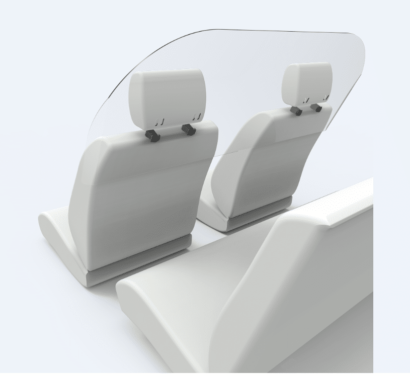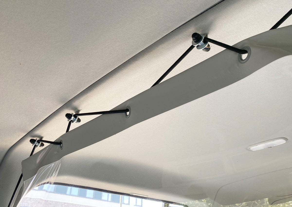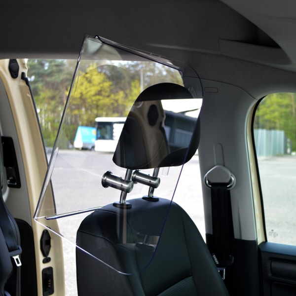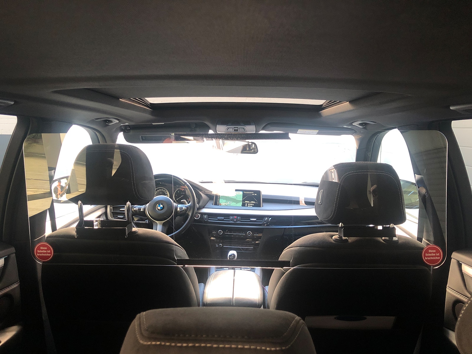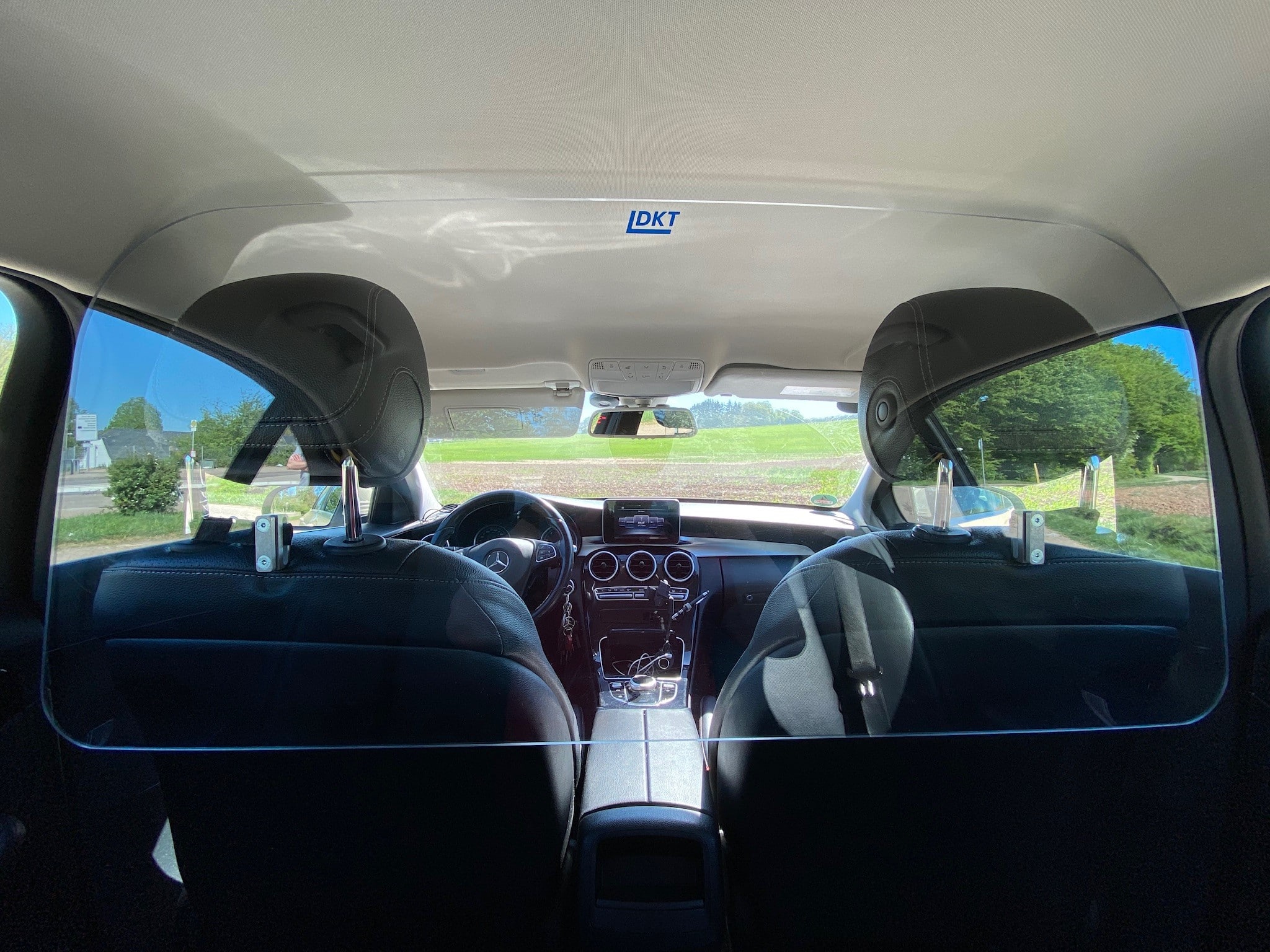 Das Unternehmen J.D.Geck GmbH aus Altena bietet eine Trennwand aus 1,5 mm PET G glasklar an. Sie hat die Abmessungen 1321mm x 450mm x 1,5mm und wird über die Schlitze in der Scheibe mit Hilfe von vier Klettschlaufen an den Kopfstützen fixiert. Die extra langen Klettschlaufen ermöglichen einen universellen Einsatz für alle gängigen Sitzabstände. Die Scheibe wird für netto 50,00 Euro netto zzgl. Versand angeboten. Kontakt: [email protected]