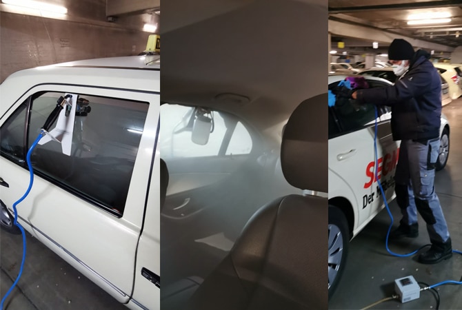 Zur Reinigung im Innenraum der Taxis wird ein geeignetes Mittel vernebelt. Nach einer kurzen Einwirkzeit muss der Wagen kurz ausgelüftet werden und der Fahrer kann wieder seinen Dienst aufnehmen. Für die gesamte Prozedur, die in knapp 15 Minuten erledigt ist, werden weniger als 30 Euro fällig. Weitere bei Taxi Times bereits erschienene Hygiene-Tipps finden Sie hier und hier.