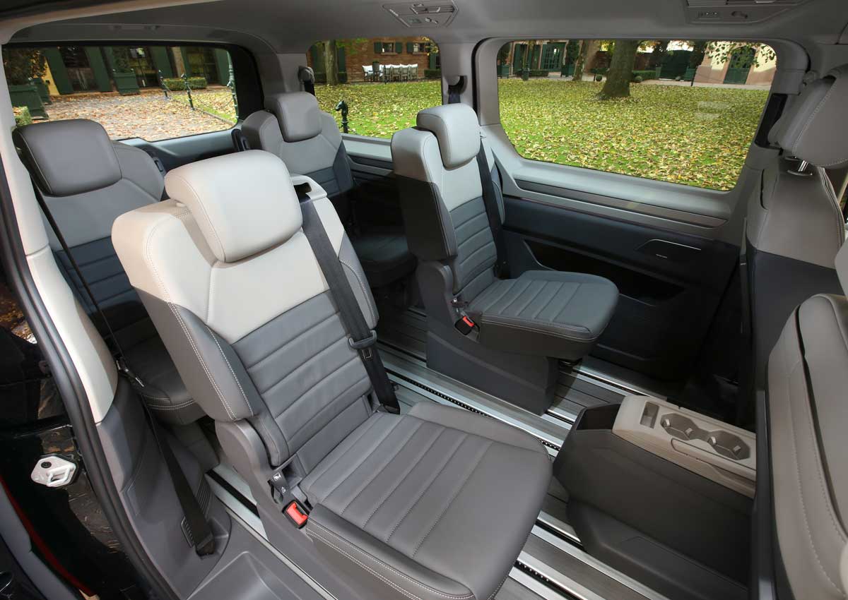 Der Innenraum des neuen Multivans hat einiges zu bieten, was ihn für den Einsatz als Business-Shuttle prädestiniert. Er bietet (inklusive Fahrer) bis zu sieben Personen Platz. Für den Fahrgast gibt es aktuell ausschließlich Einzelsitze, die mit einer Sitzheizung ausgestattet werden können. Ebenso verfügt jeder Sitz über eine Sitzplatzerkennung, die mit dem Taxameter gekoppelt werden kann. Möglich wird das durch ein stromführendes Schienensystem, welches auch eine stufenlose Verstellung der Sitze ermöglicht.
