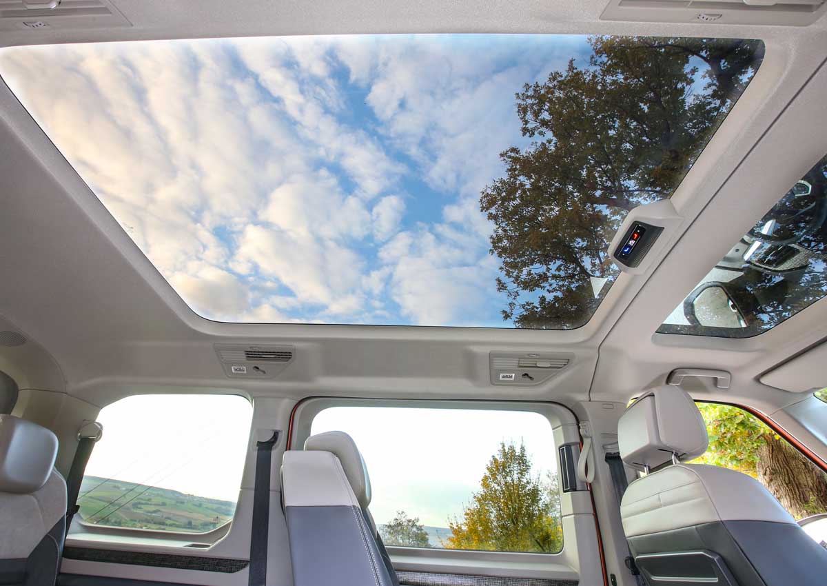 Im Hinblick auf die Personenbeförderung empfiehlt sich eine neue Option, die für mehr Innenhöhe und einen luftigeren Innenraum sorgt: Macht man einen Haken bei dem 1,8 Quadratmeter großem Panoramadach (955 Euro netto), dann stehen 2,6 Zentimeter mehr Kopffreiheit auf allen Sitzplätzen an. Lediglich der Kofferraum muss ohne das Glasdach auskommen. Schade, denn bei einem Umbau als Rollstuhltransporter könnte das die Durchfahrtshöhe einschränken. Ein echter Hinderungsgrund wird es jedoch nicht sein.