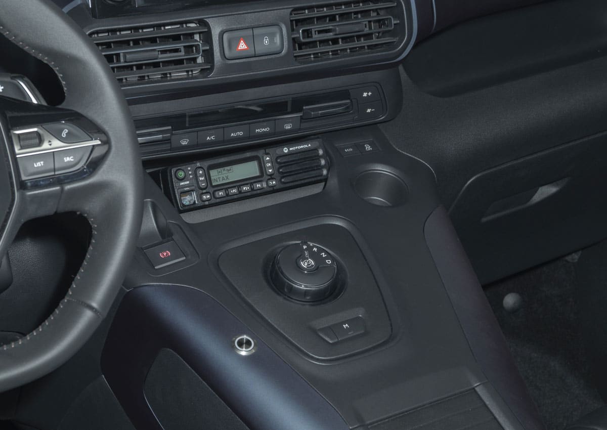 Die Konsole für den Wegstreckenzähler wird am Dachhimmel verbaut und verfügt über eine wählbare Steckverbindung. Auf Wunsch kann die Dachkonsole abgewählt werden, dann wird das Anschlusskabel für den Taxameter im Bereich des Schalthebels verbaut. Optional ist auch ein Spiegeltaxameter erhältlich. Die Kabelvorrüstung des Funkgeräts ist immer im Bereich vor dem Schalthebel zu finden. Eine eventuell vorhandene induktive Handy-Lademöglichkeit entfällt dann. Zusätzlich bietet Intax auch umfangreiche Optionen für Kunstleder bzw. Echtleder-Ausstattungen an.