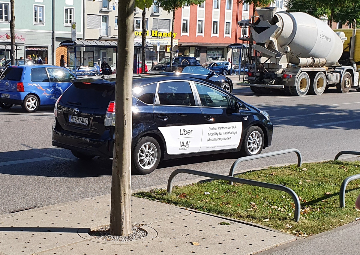 Gemeint ist die Zusammenarbeit des Verbands der Automobilindustrie (VDA) mit dem Fahrtenvermittler „Uber“, aktuell gut sichtbar auf den Münchner Straßen: Uber-Fahrzeuge tragen an den Türen einen Schriftzug mit der Aufschrift „Stolzer Partner der IAA Mobility für nachhaltige Mobilitätsoptionen“.