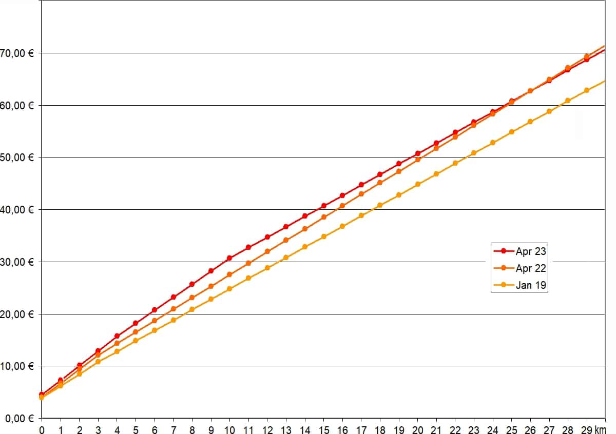 Der Tarif hat jetzt aber nicht mehr die eine bisherige Degressionsstufe bei der Marke 3,0 Kilometer, sondern eine bei 4,0 Kilometern und eine weitere bei 10,0 Kilometern. Während der Kilometerpreis bisher an der Marke 3,0 Kilometer einmalig um 50 Cent fiel, so fällt er jetzt an der 4-km-Marke um 30 Cent und an der 10-km-Marke nochmals um 50 Cent.
