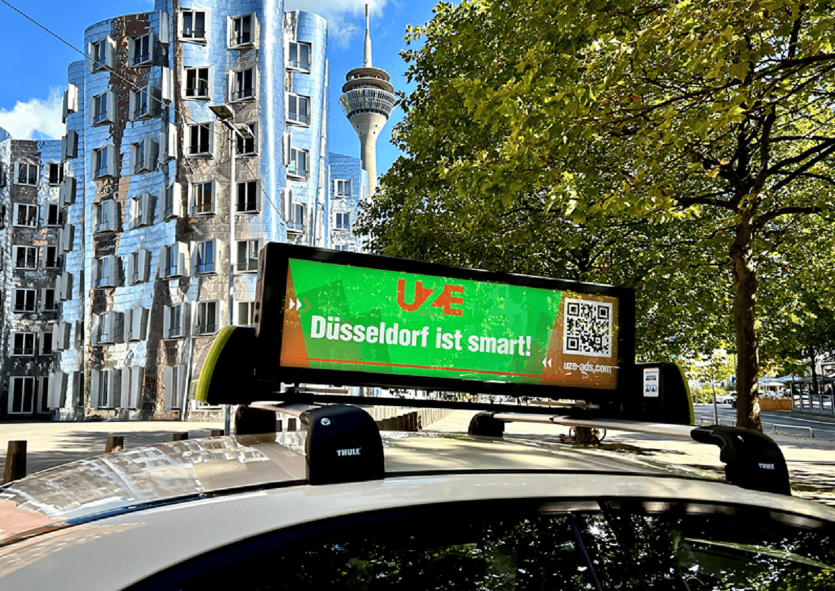 Seit rund einem Monat fahren durch Düsseldorf 60 Taxis mit Dachwerbung. Sie verfügen über eine Sensortechnik, so dass immer ein zum Ort oder zum Wetter passendes Motiv erscheint. Das sorgt für höhere Einnahmen, von denen auch die Taxiunternehmer profitieren.