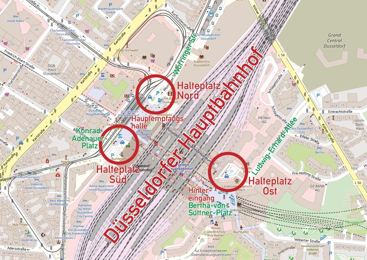 Das hat sich geändert: Die Bahntochter DB Station & Service AG hat inzwischen Verträge mit allen drei Düsseldorfer Zentralen abgeschlossen, die das Bereithalten aller Taxis vor dem Bahnhofsportal gestatten, womit ein mehrjähriger Konflikt zwischen den Düsseldorfer Zentralen beigelegt ist.