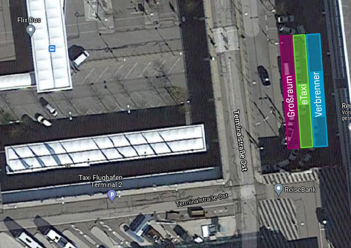 Wie IsarFunk in einem Rundschreiben an die Kollegen mitteilte, gilt diese Regelung allerdings nur temporär vom 7. bis zunächst zum 12. September. Die Betreibergesellschaft des Flughafens FMG hat dazu einen zweiten Taxi-Standplatz für zwei E-Taxis auf der anderen Straßenseite, vor dem Lufthansa Bus eingerichtet. Um diesen Platz zu gewinnen, wird die separate Taxi-Busspur für Großraumtaxis auf die „S-Bucht“ beschränkt. Die E-Taxen stellen sich zunächst in der mittleren Spur der Nachrück-Bucht am T2 (allgemein als „S-Bucht“ bekannt) bereit, bevor sie auf einen der frei werdenden neuen Stellplätze nachrücken.