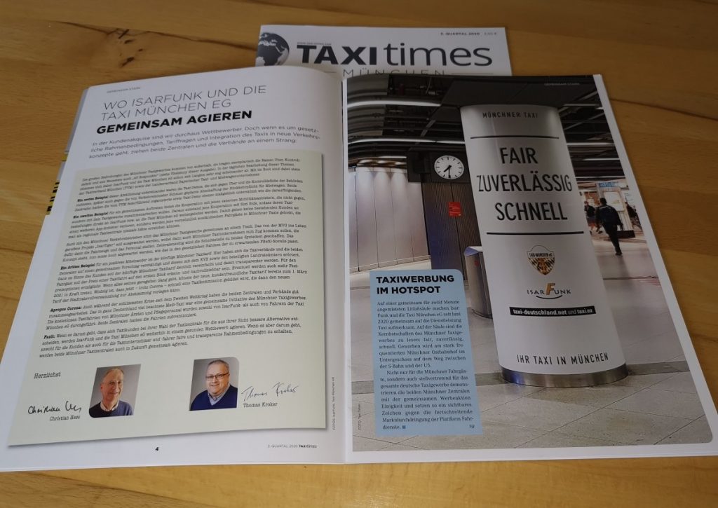 - Gemeinsam gegen externe Wettbewerber: Im Wettbewerb um die Kunden sind die beiden Taxizentralen IsarFunk und Taxi München eG Konkurrenten. Gegenüber der Politik, den Behörden und externen (illegalen) Wettbewerbern ziehen sie jedoch an einem Strang. Das haben der IsarFunk-Geschäftsführer Christian Hess und Taxi München eG-Vorstand Thomas Kroker in einer gemeinsamen Erklärung bekräftigt. Diese Erklärung erscheint sowohl in Taxi Times München als auch im Münchner „Taxikurier“, dem Veröffentlichungsorgan der Genossenschaft.