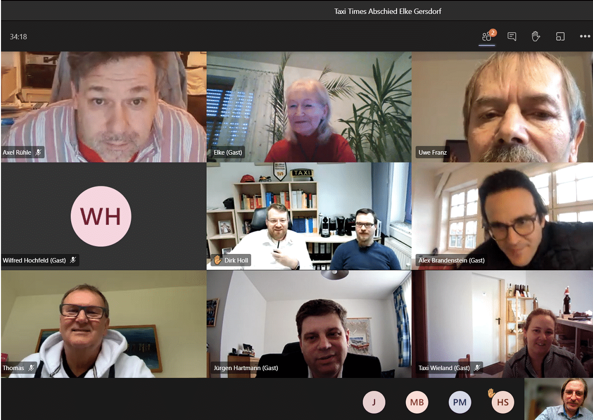 „Ich wollte Ihnen noch einmal die Ehre erweisen“, sprach Joachim Flämig vielen Teilnehmern aus dem Herzen, als er sich von Elke Gersdorf verabschiedete und sich dafür sogar aus seinem Urlaub in die Videokonferenz einwählte. Flämig betreut seit 2012 den Taxibereich für Volkswagen Nutzfahrzeuge und erinnert sich an viele persönliche Begegnungen mit Frau Gersdorf. So geht es auch Thomas Sell von der Telekom, der Elke in seinen Abschiedsworten einen „tollen Charme“ attestierte. Sie sei eine Person, die Menschen stets überzeugen konnte, etwas für die Taxibranche zu unternehmen. „Immer wenn ich dich sehe, kommt ein warmes Gefühl aus dem Herzen“, sagte Sell. Auch Sells Kolleg Christian Meyer und Kollegin Stina Perbandt hatten sich zugeschalten und wünschten ebenfalls alles Gute und „die Zeit, nun die Hobbys leben und gestalten zu können.“