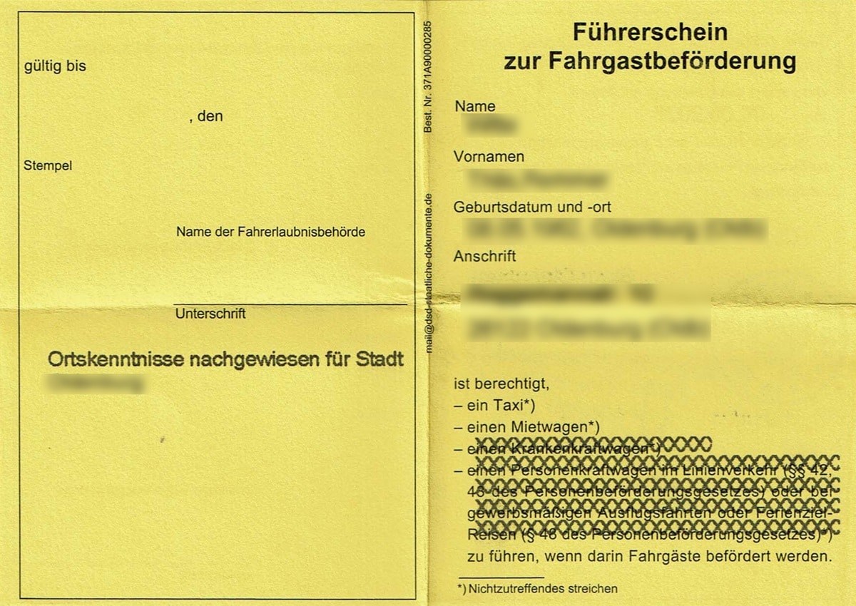Zunächst nicht zu beantworten war die spannende Frage, ob denn zukünftig ein Berliner Taxler zum Oktoberfest auch in München taxifahren dürfe. Im Rahmen der PBefG-Novelle ist ja die Ortskenntnisprüfung nunmehr als regionale Anforderung obsolet und insofern seien neue Fahrgastbeförderungsscheine ab August dann möglicherweise bundesweit mehr oder weniger uneingeschränkt gültig. Das aktuell genutzte Musterformular sieht hier keinerlei regionale Beschränkung vor, denn hier heißt es lediglich „… ist berechtigt ein Taxi zu führen“.