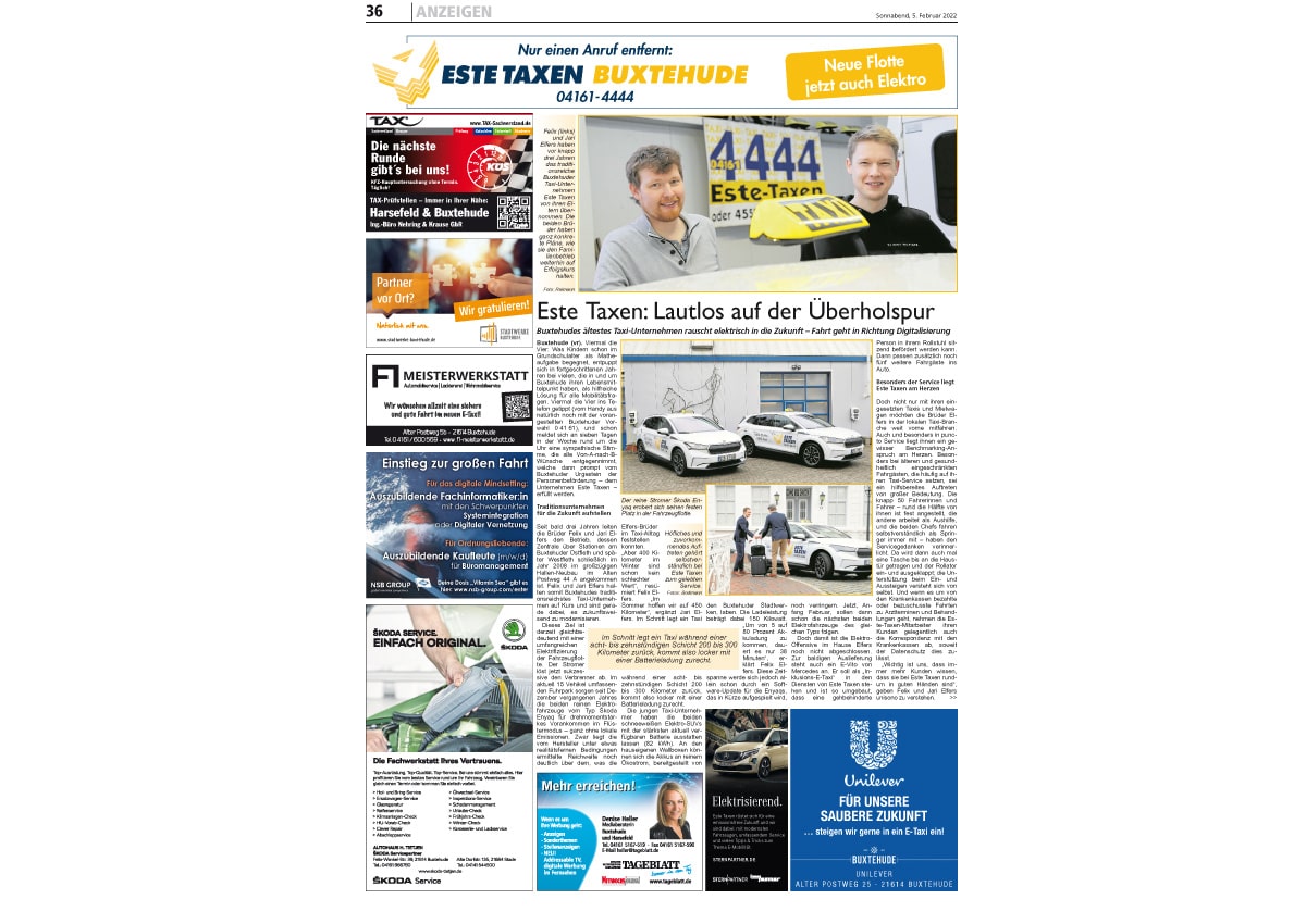 Auf der am Samstag erschienenen Doppelseite werden die Leser des Buxtehuder Tageblatt über die lange Geschichte des Unternehmens, das fest in Buxtehude verwurzelt ist, informiert. Neben einer persönlichen Vorstellung der beiden jungen Unternehmer Jari und Felix Elfers, deren Taxiunternehmen 15 Konzessionen führt, räumt der Bericht mit den gängigen Mythen rund um die Elektromobilität auf und zeigt, dass E-Taxis keine vorübergehende Randerscheinung bei Este Taxen sein werden.