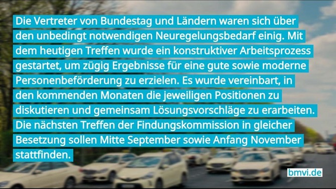 „Scheuers Eckpunkte müssen weg“, fordert die Taxibranche. Eine Novellierung des Personenbeförderungsgesetzes wird man wohl nicht verhindern können. Dies wird aus einer Kurzmitteilung deutlich, die vom Bundesministerium für Verkehr und digitale Infrastruktur (BMVI) heute unmittelbar im Anschluss an ein Treffen der Findungskommission veröffentlicht wurde: „Die Vertreter von Bundestag und Ländern waren sich über den unbedingt notwendigen Neuregelungsbedarf einig. Mit dem heutigen Treffen wurde ein konstruktiver Arbeitsprozess gestartet, um zügig Ergebnisse für eine gute sowie moderne Personenbeförderung zu erzielen. Es wurde vereinbart, in den kommenden Monaten die jeweiligen Positionen zu diskutieren und gemeinsam Lösungsvorschläge zu erarbeiten. Die nächsten Treffen der Findungskommission in gleicher Besetzung sollen Mitte September sowie Anfang November stattfinden.“