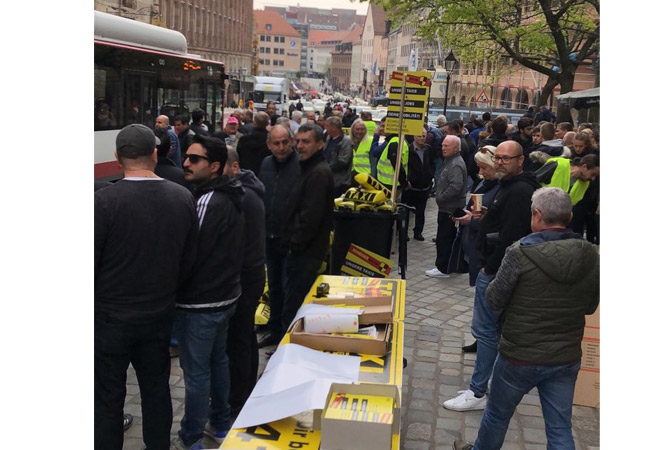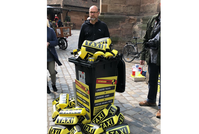 14:43 Uhr Ein erstes Foto aus Nürnberg. Hier werfen die Taxiunternehmer symbolisch ihr Dachzeichen in die Tonne.