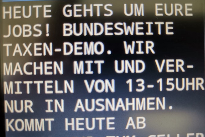 06:10: Auch die Taxizentralen beteiligen sich am Protest. Etliche von ihnen werden im Laufe des Tages für mindestens eine Stunde die Vermittlung einschränken bzw. einstellen Infos dazu hier.