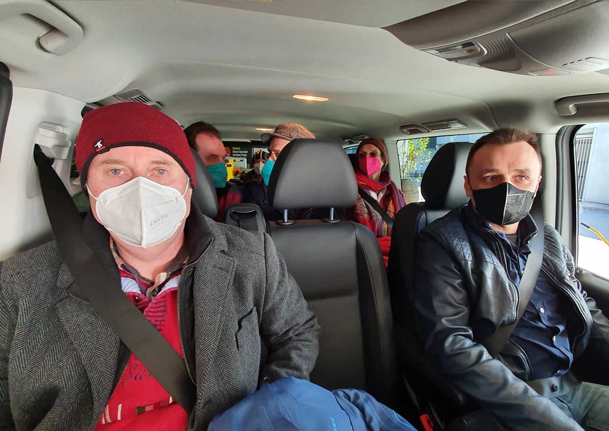 Nach einem kurzen Exkurs zu den einzelnen Details am Fahrzeug, die auch die Ladebuchse und das Ladekabel betrafen, stand die erste Probefahrt an. Bei einer gemeinsamen Tour konnten alle Teilnehmer einen ausführlichen Fahreindruck gewinnen – aus der Sicht des Fahrers, der Fahrgäste und sogar aus der Sicht eines Rollifahrers. Um sich ein Bild davon zu machen, wie man die Fahrt in einem Rollstuhl wahrnimmt, musste sich jeder Workshop-Teilnehmer, auch im Rollstuhl sitzend, chauffieren lassen. Genau wie der gesamte Workshop, eine wirklich sehr wertvolle Erfahrung, so der Tenor der zukünftigen E-Inklusionstaxi-Fahrer. sg