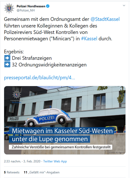 Geçtiğimiz hafta Perşembe günü Kassel polisi taksi benzeri Limuzin servisi „Minicars“ ı kontrol etti ve hem iş hukuku hem de velayet yasasının yanı sıra geri Şirketlerine dönme yükümlülüğüne karşı da bir dizi ihlali ortaya çıkardı. Kontrol edilen sürücülerin üçte biri geçici olarak lisanslarından yoksun bırakıldı.