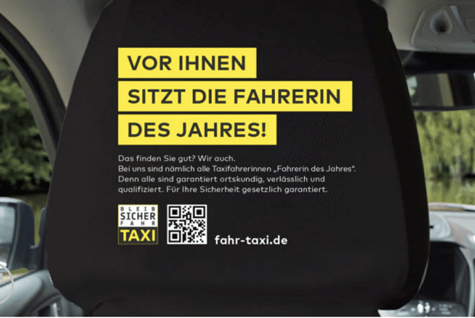 „Vor Ihnen sitzt der Taxifahrer des Jahres!” Kopfstützenüberzüge mit diesem Slogan sind seit rund einem halben Jahr Teil einer umfangreichen Taxi-Kampagne. Sie sind nun zum ermäßigten Preis erhältlich.