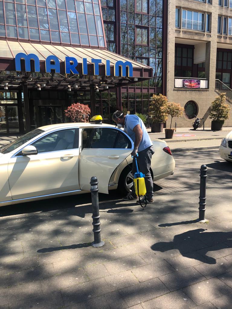 Pazartesi gününden beri Çağrı merkezi „Taxi Ruf Köln“ yüzey dezenfektanları önlemek için faaliyete geçti çünkü: Patojenler yüzeylerde aylarca yaşayabilir ve insanlara el veya toz yoluyla bulaşabilir. Dezenfektanların amacı, bakteri yükünü azaltmak ve böylece enfeksiyon riskini azaltmaktır.