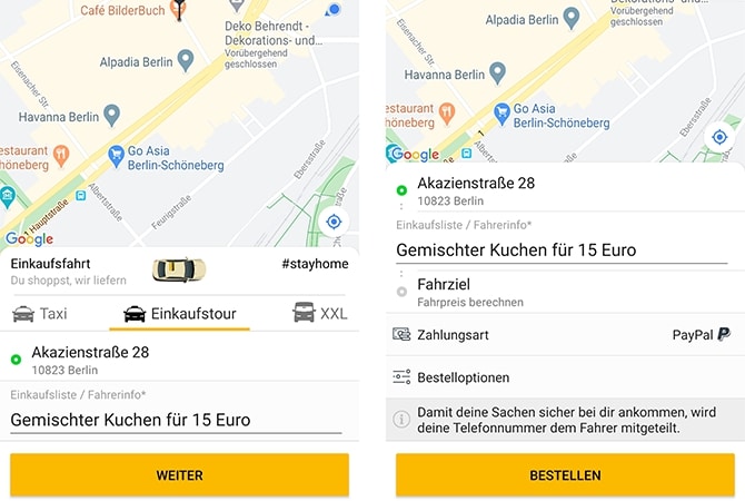 Model Berlin’de başarıyla başlatıldıktan sonra, uygulama geliştirici fms modeli müşteriye bir mesajla açıkladı: „Kullanıcı ‚Alışveriş turu‘ ürününü seçiyor, teslimat adresini giriyor ve Alışveriş listesi / Sürücü bilgi alanına daha sonra taksi ile teslim edilen uygun yiyecekler. Teslimat adresine bağlı olarak, taksi şoförü sipariş aldıktan sonra en yakın mağazaya gider ve alışverileri yapar. Müşterinin ek maliyeti yoktur ve yalnızca satın alma ve seyahat masraflarını öder. “Yani yol aynı zamanda diğer merkezler ve hatta taxi.eu için açık. Taksi Berlin Genel Müdürü Hermann Waldner’e göre, taksi uygulaması ile nakitsiz ödeme, faturalandırmanın kolay ve güvenli bir şekilde gerçekleştirilmesi için bir ön koşuldur. Bu nedenle, ‚alışveriş turu‘ ürünü taksi uygulamasında yalnızca kullanıcı PayPal, kredi kartı, Amazon Pay veya Apple Pay gibi nakitsiz bir ödeme yöntemi yatırdıysa kullanılabilir. İstenirse yine de nakit ödeme yapabilir – yukarıdaki eczane siparişine bakın. ar