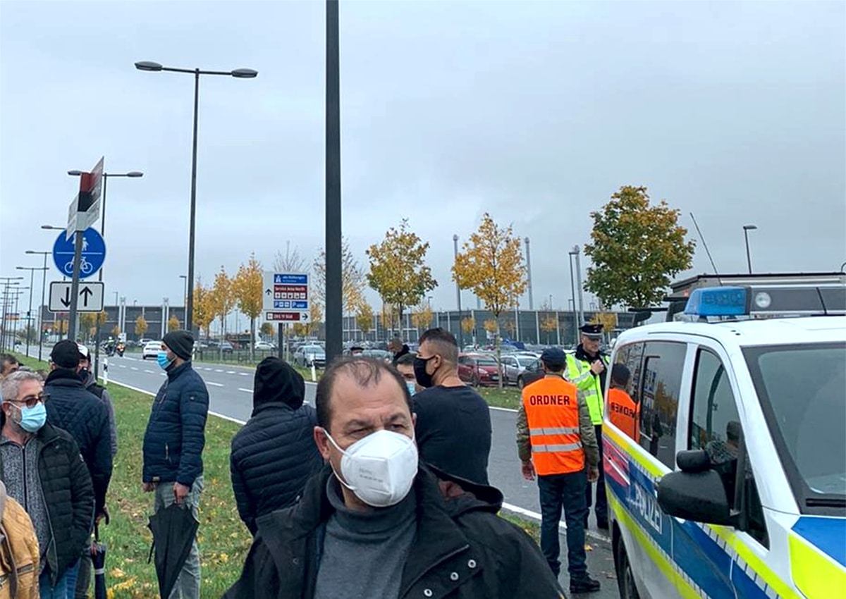 Künftig eher selten zu erwarten: Taxifahrer mit Mund-Nasen-Bedeckung am Taxispeicher T1 (hier bei der Demo am Tag der Flughafen-Eröffnung) Foto: Simi