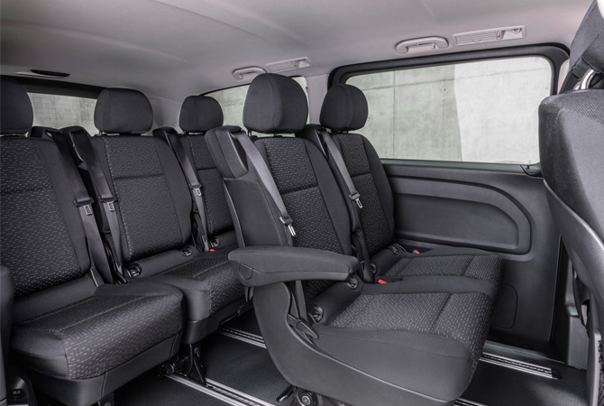 Den eVito kann man in der Karosserievariante lang und extralang bestellen. Bei der Bestuhlung verweist Mercedes-Benz Vans auf die vielfältigen Sitzkonfigurationen, wovon speziell die Taxiunternehmen profitieren sollen. Maximal acht Fahrgäste können in den drei Sitzreihen befördert werden. Der eVito eignet sich laut Mercedes aber nicht nur als Großraumtaxi, sondern auch als Hotelshuttle oder für den Einsatz als Ride-Sharing Fahrzeug (Berlkönig lässt grüßen)