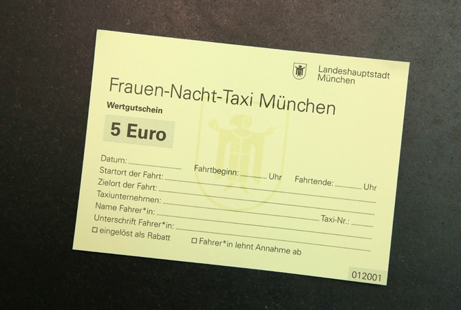 Zunächst für ein Jahr will die Stadt München Erfahrungen mit dem Frauen-Nacht-Taxi Gutschein sammeln, bevor über eine dauerhafte Einführung des Angebots nachgedacht wird. Seit dem 1. März dürfen sich Frauen ab 16 Jahren maximal drei Gutscheine pro Tag in den Bürgerbüros den Sozialbürgerhäusern oder in der Gleichstellungsstelle und der Stadtinformation im Rathaus abholen.