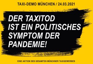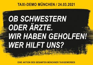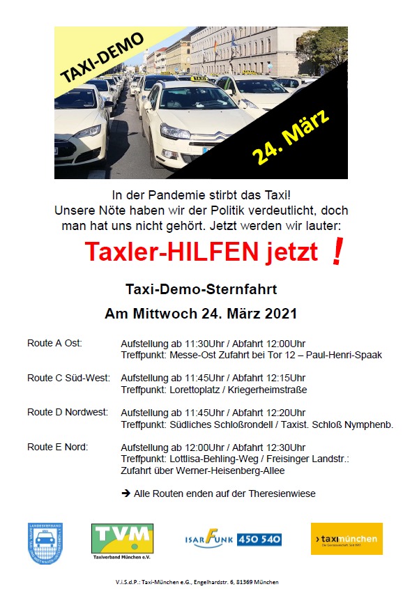 Mit einer Sternfahrt aus vier Richtungen wird das Münchner und Bayerische Taxigewerbe am 24. März seinen Unmut über die bisherige politische Ignoranz freien Lauf lassen. Die Taxidemo wird von den bayerischen Gewerbeverbänden Taxi Bayern und Taxiverband München (TVM) sowie den beiden Münchner Zentralen IsarFunk und Taxi München eG organisiert und steht unter dem Motto einer einzigen Forderung: „Taxler-Hilfen JETZT!“