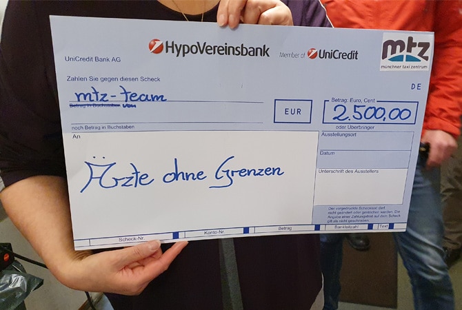 Ende 2019 haben sich viele der rund 250 Mitarbeiter des Taxibetriebs Münchner Taxi Zentrum (MTZ) dazu entschieden ihr ‚Weihnachtsgeschenk‘ einem guten Zweck zukommen zu lassen. So viel Einsatz wurde dann auch vom Unternehmen unterstützt, indem die Spendensumme verdoppelt wurde. Insgesamt sind dadurch 2.500 Euro zusammengekommen, die an die internationale Hilfsorganisation ‚Ärzte ohne Grenzen‘ gespendet werden konnten. Mit dem Geld können jetzt weltweit Projekte umgesetzt werden, die in erster Linie darauf ausgelegt sind, kurzfristig Menschen in Not zu unterstützen und mit dem Nötigsten zu versorgen.