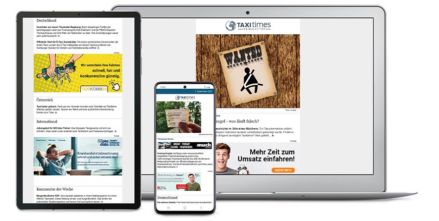 Der Taxi Times Newsletter erscheint jeden Dienstag und Freitag und fasst die wichtigsten Nachrichten aus der Taxibranche zusammen. Die Anmeldung ist kostenlos und kann jederzeit storniert werden.