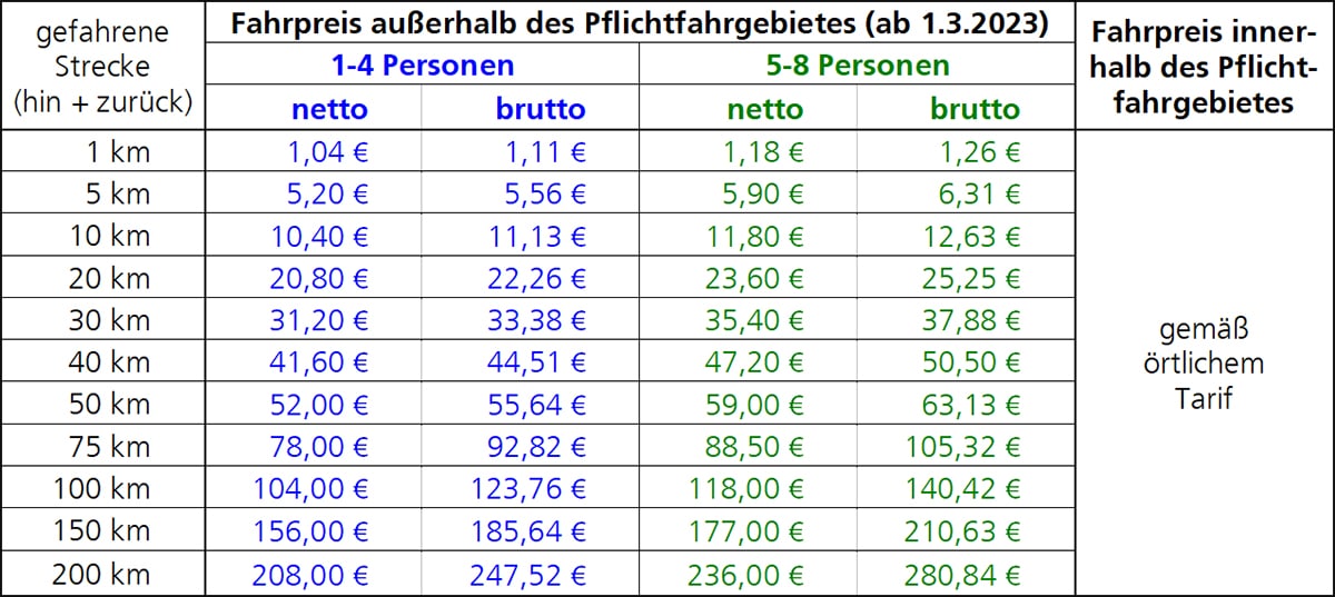 Fahrten mit bis zu vier Personen werden mit 1,04 Euro netto pro gefahrenem Kilometer abgerechnet. Das bedeutet, dass auch die Rückfahrt vergütet wird. Zu den Nettopreisen kommen 7 Prozent Mehrwertsteuer, bei Fernfahrten (über 50 Kilometer) 19 Prozent Mehrwertsteuer.