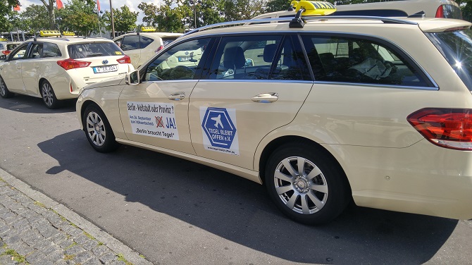 In den Wahlkampf um die Ja-Stimme haben sich nun auch etliche Berliner Taxis eingeschalten. Der Verein „Tegel bleibt offen e.V.“ hat bei der Berliner Firma „Phönix Taxiwerbung“ Außenwerbefolien für 300 Taxis erstellen lassen, auf denen neben dem Logo des Vereins „Tegel bleibt offen e.V.“ auch der Schriftzug „Berlin – Weltstadt oder Provinz“ und „Berlin braucht Tegel“ angebracht sind. Dazwischen weist ein Text darauf hin, dass man am 24. September zum Volksentscheid „ja“ ankreuzen solle.