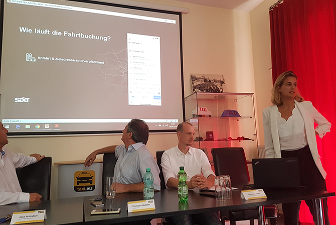 Bei einem Treffen im Berliner Taxi-Museum informierten Sixt-Manager Johannes Boeinghoff und taxi.eu-Geschäftsführer Hermann Waldner am 20. Juni über die Kooperation beider Apps, die demnächst auf Berlin ausgeweitet wird.