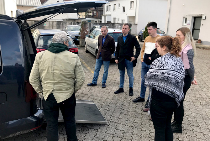 Die sechsköpfige Gruppe wurde mit einem Londoner LEVC-E-Taxi abgeholt – eine besondere Einführung. Null Emission hat einen wichtigen Platz im Unternehmen Holl. Ebenso wie die Rollstuhlbeförderung, die Fahrer Sammy auf dem Weg in Ettlingen (wo Holl ‘My Shuttle’ fährt) den Ladevorgang und den Platz für Menschen mit Mobilitätsbehinderungen (ob im Rollstuhl oder nicht) im geräumigen Taxi demonstrierte. Die Idee des Inklusionstaxis nahm die Delegation begeistert auf, denn da liege in Russland doch einiges im Argen.