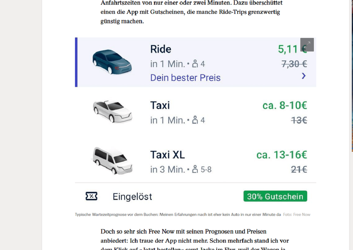 Anmerkung der Redaktion: Free Now war früher mytaxi und bietet heute in seiner App sowohl Taxi- als auch Mietwagenfahrten an. Der Screenshot im Spiegel-Artikel macht einmal mehr deutlich, dass der frühere Taxipartner längst die Seiten gewechselt hat und allen Kunden zwar nach wie vor eine Taxibestellung verspricht, ihnen aber immer zuerst die günstigere Mietwagenfahrt schmackhaft macht. Somit werden die App-Kunden, die eigentlich ein Taxi wollen, noch während der Bestellung zum Mietwagen gelockt. Als Free Now-Partner in Hellelfenbein muss man sich da doch vera… vorkommen.