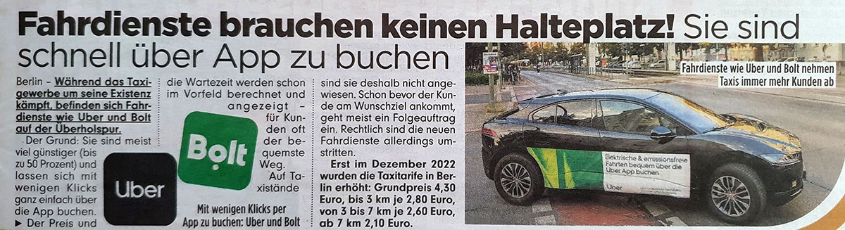Die „B.Z.“ hat am vergangenen Mittwoch auf die Problematik zunehmend reduzierter Taxihalteplätze hingewiesen und in einem darauf aufbauenden Kommentar sowohl das Uber-Modell als auch deren Fahrer an den Pranger gestellt. Ein Zusatzbeitrag zu Uber, Bolt & Co wirkt dagegen wie versteckte Werbung.