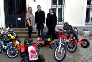 Eğitim ve pedagojik Sorumlusu Rahibe Faustine Malodobry, Taxi 40100 tarafından bağışlanan on bir yeni Çocuk-araçlarına memnun kaldı. 3000 Euro’dan daha fazla değerinde olan Go-kart, bisiklet ve oyuncak Traktörler tesisin bahçesinde çocuklar tarafından kullanılacak.
