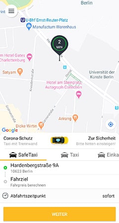 Nach der Einführung der Option „Einkaufstour“ hat die Funkzentralengemeinschaft taxi.eu jetzt in Zusammenarbeit mit dem Software-Entwickler fms Systems GmbH die Möglichkeit in die App implementiert, ein „SafeTaxi“ zu bestellen.
