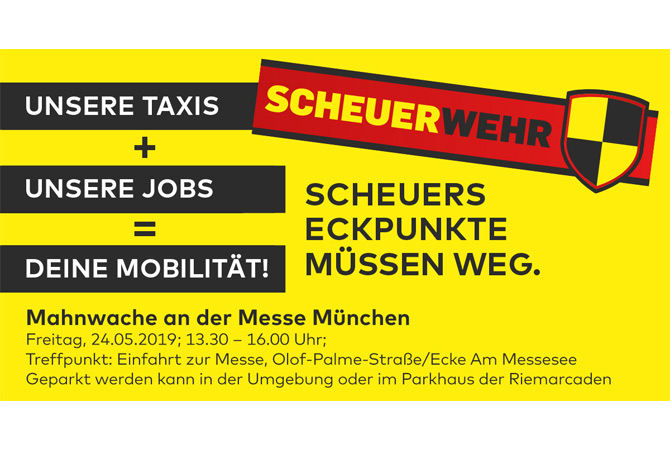 Die Scheuerwehr wird abermals aktiv werden – diesmal in München Am kommenden Freitag wird das Münchner Taxigewerbe im Umfeld der Abschlusskundgebung der Europäischen Volkspartei (EVP) zur Europawahl mit einer Mahnwache auf die Probleme des Gewerbes aufmerksam machen. Innen werden dann Politgrößen sein, außen protestierende Taxler. Mal sehen, ob es zum direkten Austausch mit Frau Merkel, Herrn Söder oder auch Frau Kramp-Karrenbauer kommt.