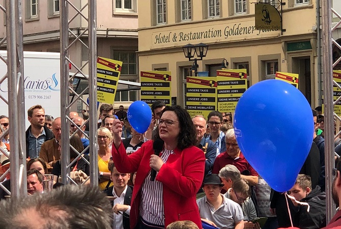 Bei ihrem anschließenden Auftritt bei der Wahlveranstaltung am Marktplatz von Heidelberg begrüßte Frau Nahles von der Bühne aus auch diejenigen Taxiunternehmer und Fahrer, die nicht am Gespräch teilgenommen, sich aber mit ihren Schildern unter die Zuschauer gemischt hatten „Das hat die anwesenden Taxifahrer und Unternehmer sehr gefreut“, berichtet Lang.