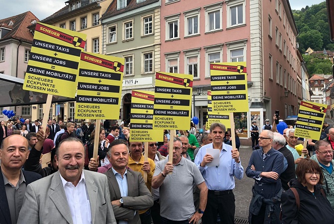 Bei einer Europawahl-Kundgebung am Samstagnachmittag im Nord-Württembergischen Heidelberg waren rund 50 Taxiunternehmer und Taxifahrer erschienen. Die Mehrzahl von ihnen aus Heidelberg, Unterstützung gab es aber auch von Kollegen aus Karlsruhe und Mannheim. Mitgebracht hatten die Unternehmer die bundesweit einheitlich gestalteten Protestschilder zur „Scheuerwehr“, mit denen die Branche seit Monaten darauf hinweist, dass die vom Bundesverkehrsministerium veröffentlichten Pläne für eine Änderung des PBefG eine Existenzvernichtung für das Taxigewerbe bedeuten würde – was wiederum die Mobilität der Bevölkerung einschränken würde, wenn das Taxi als wichtiger Teil der Daseinsvorsorge wegfällt.