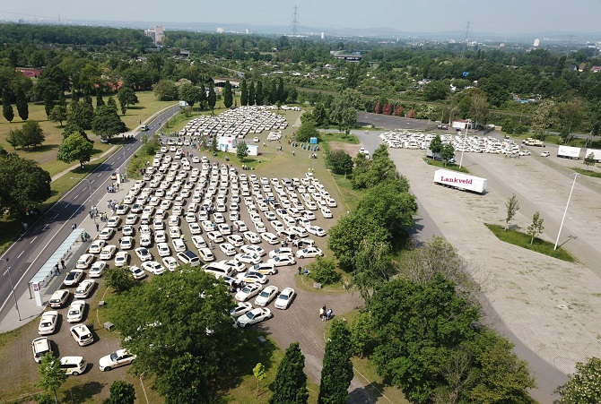 Während der Fahrt ging „Simi“ immer wieder „auf Sendung“, was vor allen Dingen die „Nicht-Frankfurter“ live auf Facebook verfolgten. Er hatte sich am Getaway Garden (- Nachrückbereich – Palette) am Frankfurter Flughafen eingefunden, einem ersten Sammelpunkt vor einem ereignisreichen Tag. Kurz nach 10.30 Uhr machten sich dann von dort in Eigenregie, also ohne Polizeibegleitung etwa 200 Taxis zum ersten Etappenziel nach Rebstock – Parkplatz E6 auf, wo zu diesem Zeitpunkt bereits mehr als eintausend Taxis warteten.