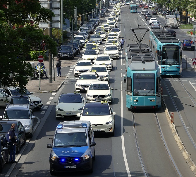 Der Taxikorso mit mehr als eintausend Taxis, setzte sich dann gegen 12 Uhr mit Polizeibegleitung in Bewegung. Laut hupend machten die Kollegen auf sich aufmerksam. Am Mainkai wurden die Taxis auf der Straße geparkt. Das letzte Stück zur Kundgebung auf dem Römerberg gingen die Kollegen dann zu Fuß. hs