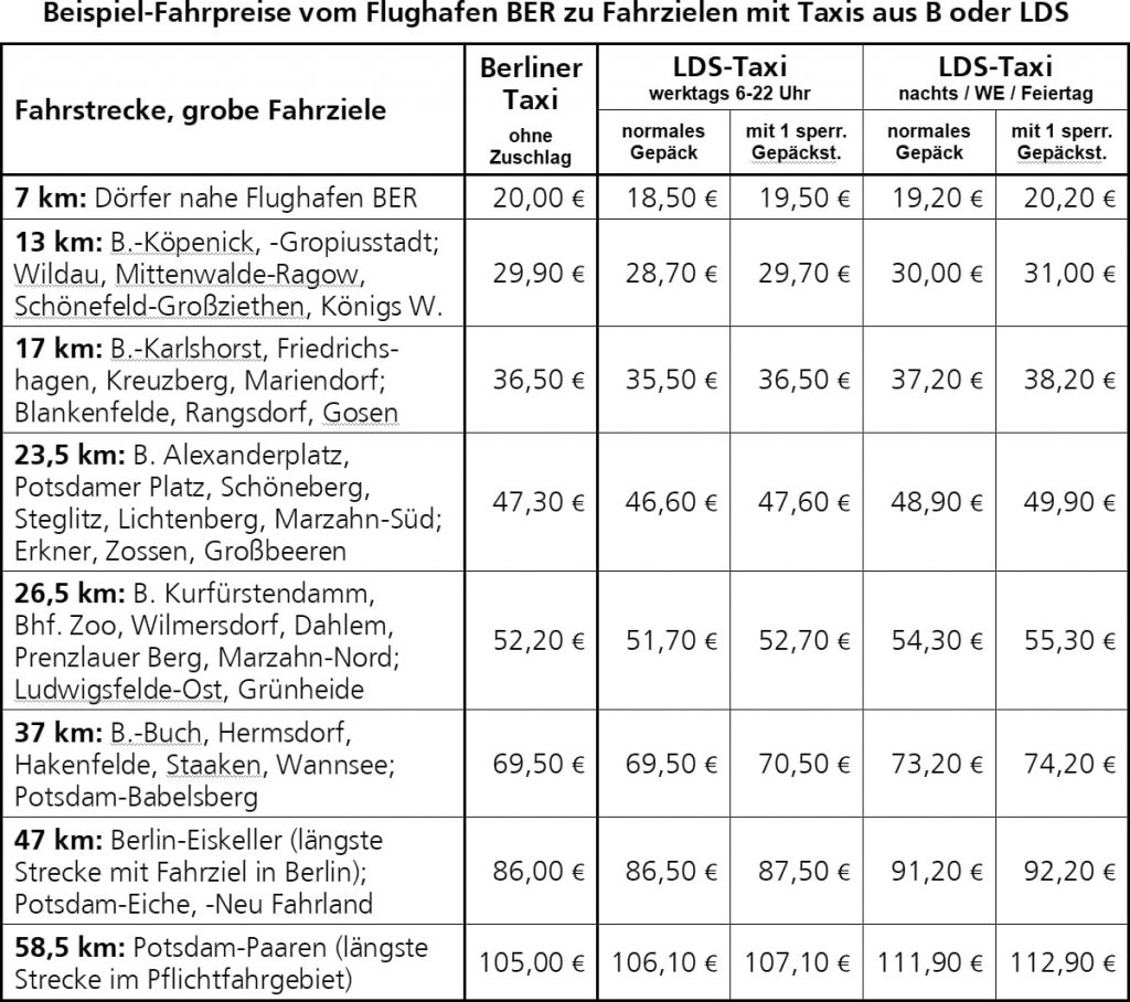 Die angegebenen Preise gelten nur bei Einstieg am Flughafen BER, Terminal 1, und beinhalten für LDS-Taxis immer den Zuschlag für die „Nutzung kostenpflichtiger Taxeninfrastruktur mit Aufruf zur Ladung am Flughafen je Aufnahme“ in Höhe von 1,50 Euro. Beginnt die Fahrt woanders (etwa an einem Halteplatz in Berlin), so müssen 1,50 Euro abgezogen werden (so lange keine anderslautende Regelung in Kraft tritt). ar
