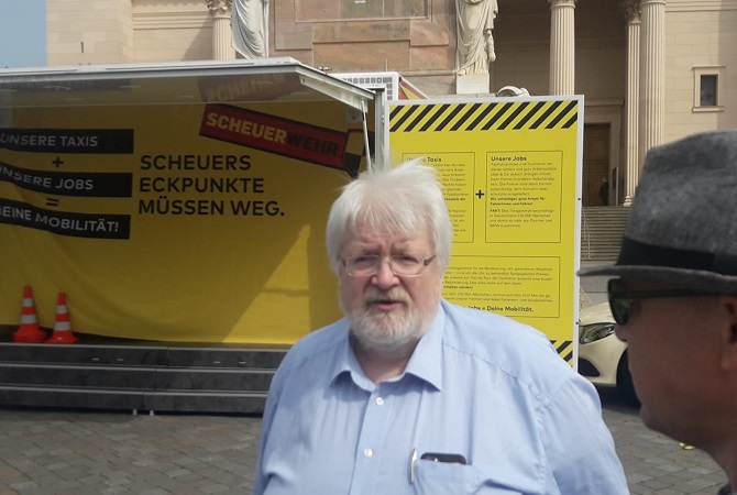 8.30 Uhr: Berliner Verband unterstützt Scheuerwehr-Tour:Die Innung des Berliner Taxigewerbes e. V. hat per Mail ihre Mitglieder dazu aufgerufen, sich an den ersten beiden Stationen der Scheuerwehr-Tour aktiv zu beteiligen. Sowohl für die Fahrt nach Potsdam am 11.6. als auch für die Fahrt nach Schwerin am 12.6. organisiert der Verband Sammeltouren. Darüber hinaus stellt die „Innung“ auch den Bus-Fahrer. Vorstandsmitglied Rolf Feja wird den Taxibus steuern, der den mobilen Anhänger von Landeshauptstadt zu Landeshauptstadt zieht und dort jeweils zur Kundgebungsbühne umfunktioniert wird. „Wie damals der Eiserne Gustav im Jahr 1928 mit seiner Droschke nach Paris aufgebrochen ist, wird der Eiserne Rolf heute mit dem Wagen unterwegs sein”, schreibt Fejas Vorstandskollege Leszek Nadolski.