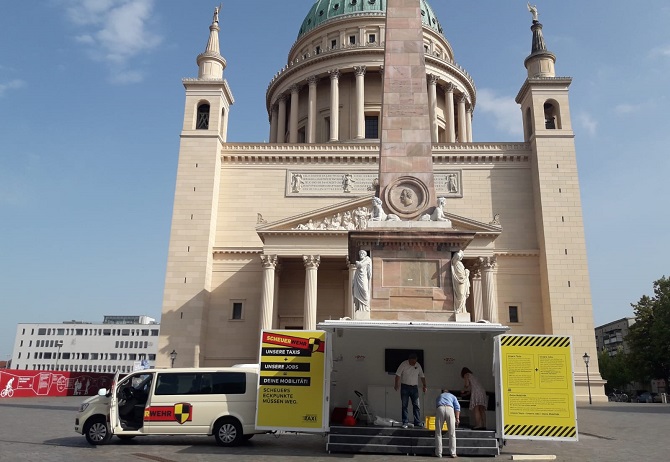 10.25 Uhr: Bei jeder Station wird mindestens ein Vorstand des Bundesverband Taxi persönlich vor Ort sein und sprechen. In Potsdam ist es der Verbandspräsident Michael Müller.