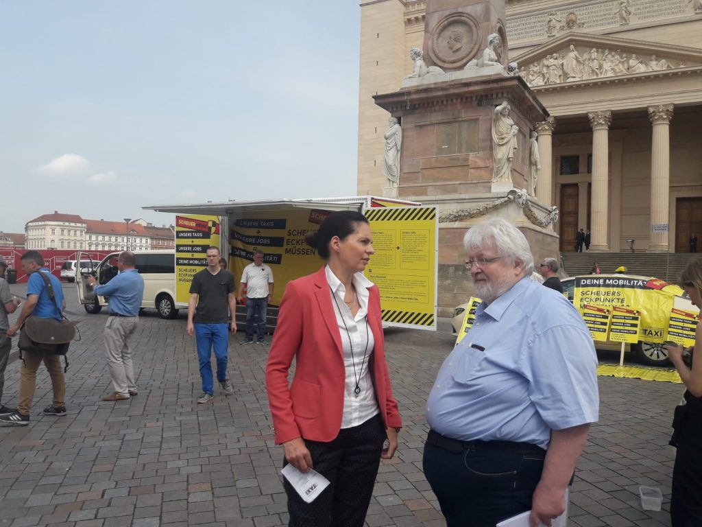 10:30 Uhr: Die Kundgebung hat begonnen, Verbandspräsident Michael Müller erläutert, warum Scheuers Eckpunkte weg müssen. Taxi Times überträgt live auf Facebook: https://www.facebook.com/taxitimes/videos/2253412174750092